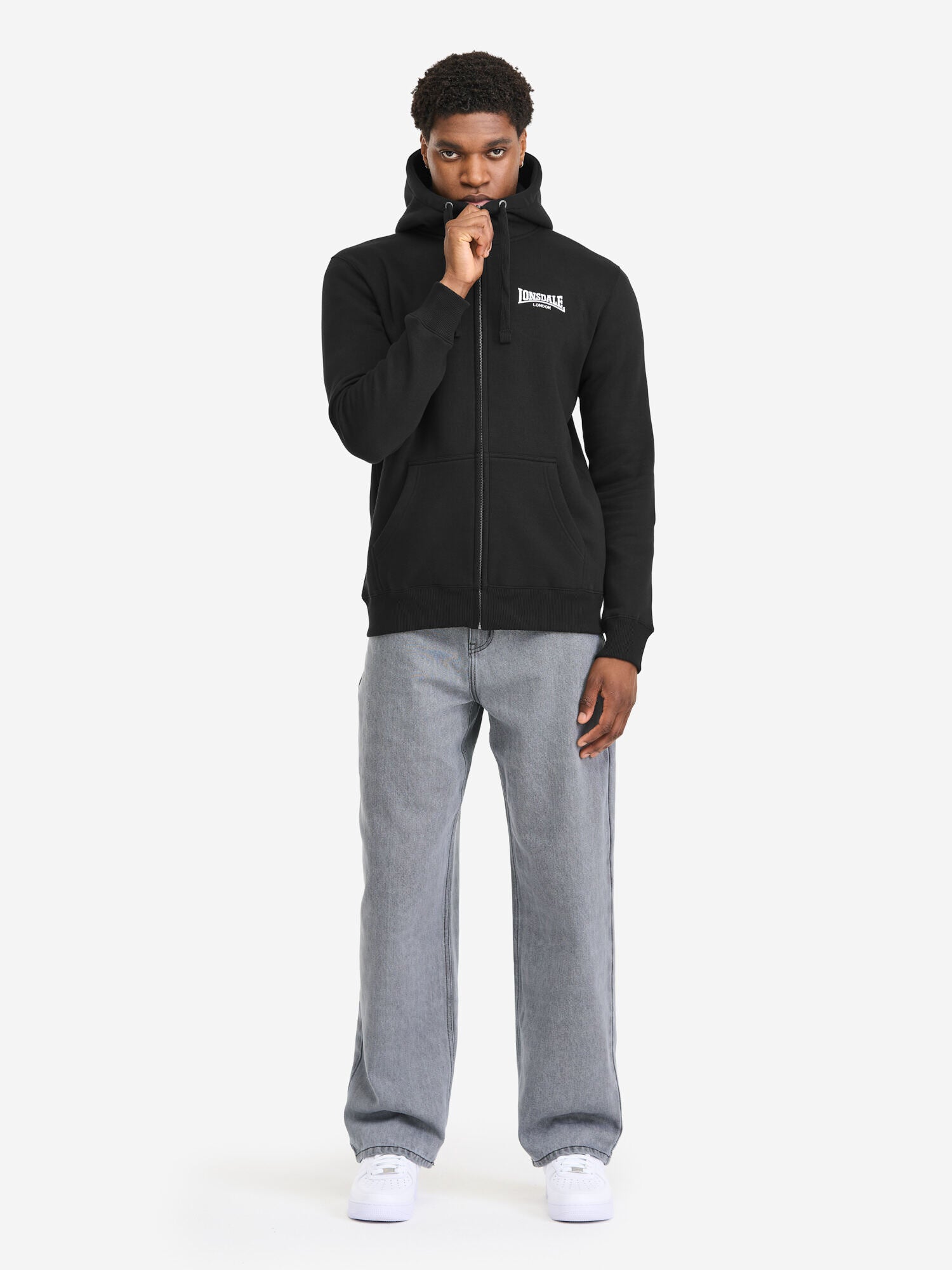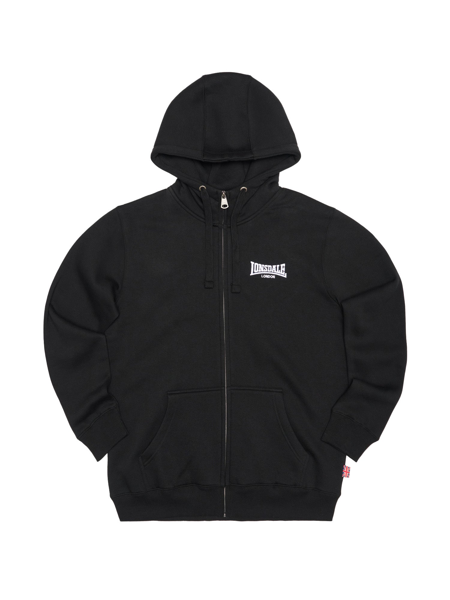Schlicht, ja - langweilig, niemals! Die Herren Kapuzensweatjacke von Lonsdale kombiniert Komfort und Style: Mit Reißverschluss, Kapuze, einer Logo-Stickerei auf der Brust und einer praktischen Kängurutasche ist sie vielseitig einsetzbar. Das besondere Detail ist das Union Jack-Label in der linken Seitennaht. Rippbündchen an Ärmel und Saum sorgen für eine perfekte Passform. Gefertigt aus im angerauten Fleece bietet sie angenehmen Tragekomfort und Wärme – ideal für Freizeit, Sport oder unterwegs!