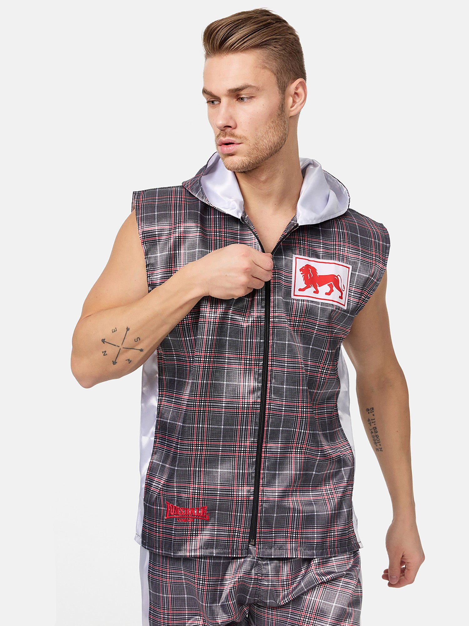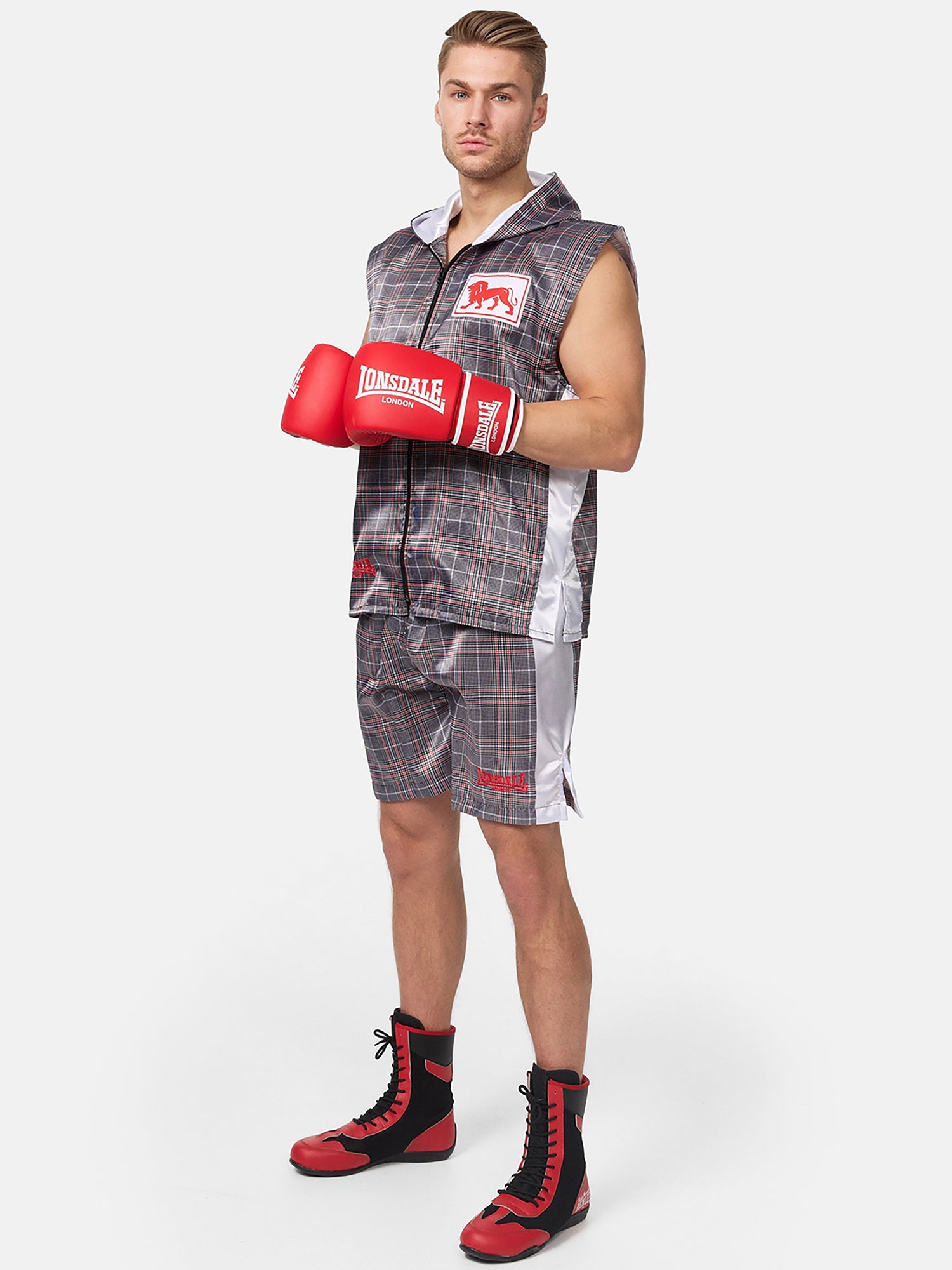 Diese modische ärmellose Ringjacke von LONSDALE ist mit Kapuze und aus glänzendem Satin gefertigt. Für coole Hingucker sorgen die Logo Details auf der linken Brust, am Saum und auf der Kapuze. Diese kannst du beim Einlaufen lässig über den Kopf ziehen. Wenn du im Ring angekommen bist, vereinfachen der durchgehende Reißverschluss sowie die extra weiten Armlöcher das Ausziehen der Jacke. Mit dem Oberteil brauchst du dir um dein Outfit also keine Gedanken zu machen und kannst dich voll auf die bevorstehende Zeit im Ring konzentrieren.