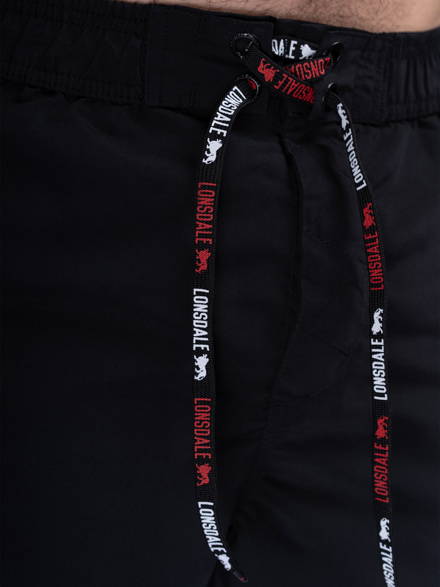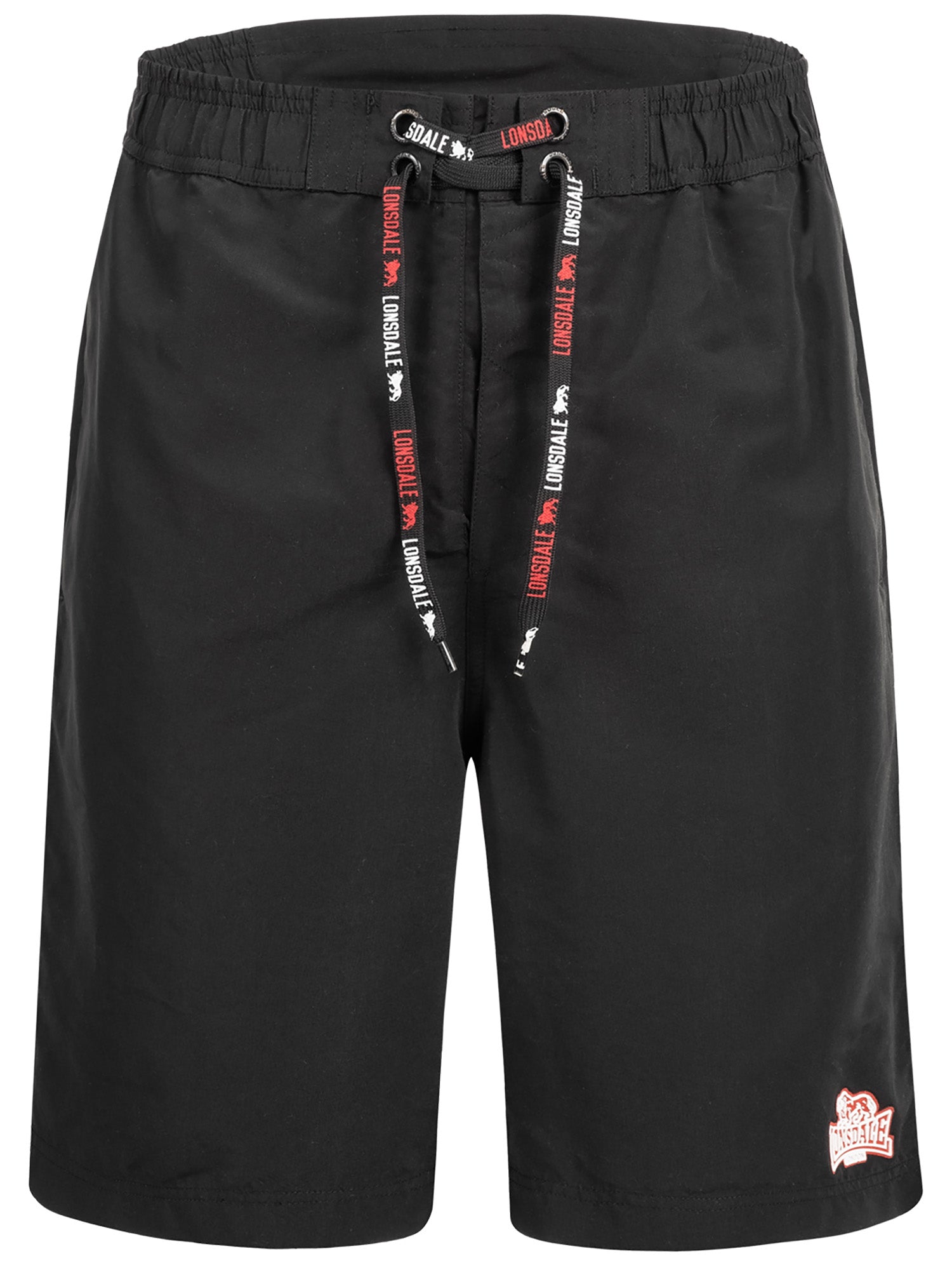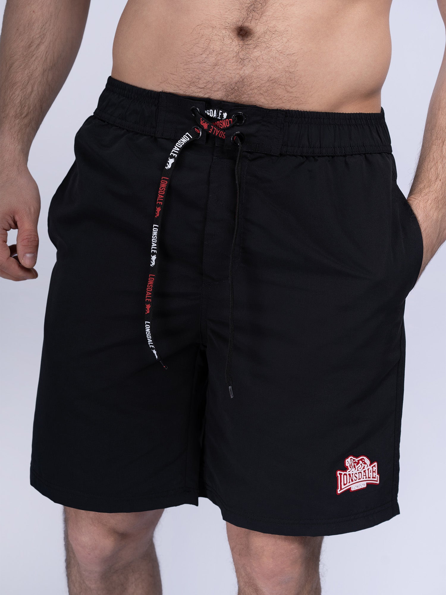 Du willst mal wieder ins Schwimmbad? Dann ist die Beachshorts DUNBEATH genau das Richtige für dich! Die auf den ersten Blick schlichte Badehose überzeugt mit vielen kleinen Details wie beispielsweise dem zweifarbigen 3D-Gummi-Logo am Hosenbein oder den bedruckten Kordelzügen. Diese sind am elastischen Bund befestigt und unterstützen eine perfekte Passform im Bereich der Hüfte. An den Seiten sowie der Rückseite befinden sich insgesamt 3 Taschen. Die aufgesetzte Gesäßtasche kann, genau wie der Schritt, mit Hilfe eines Klettverschlusses geöffnet bzw. geschlossen werden. Für noch mehr Freude beim Wassersport - die Badeshorts von Lonsdale.