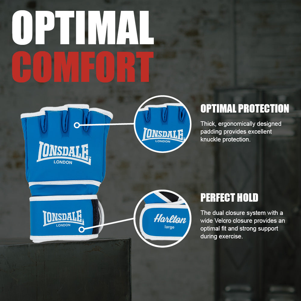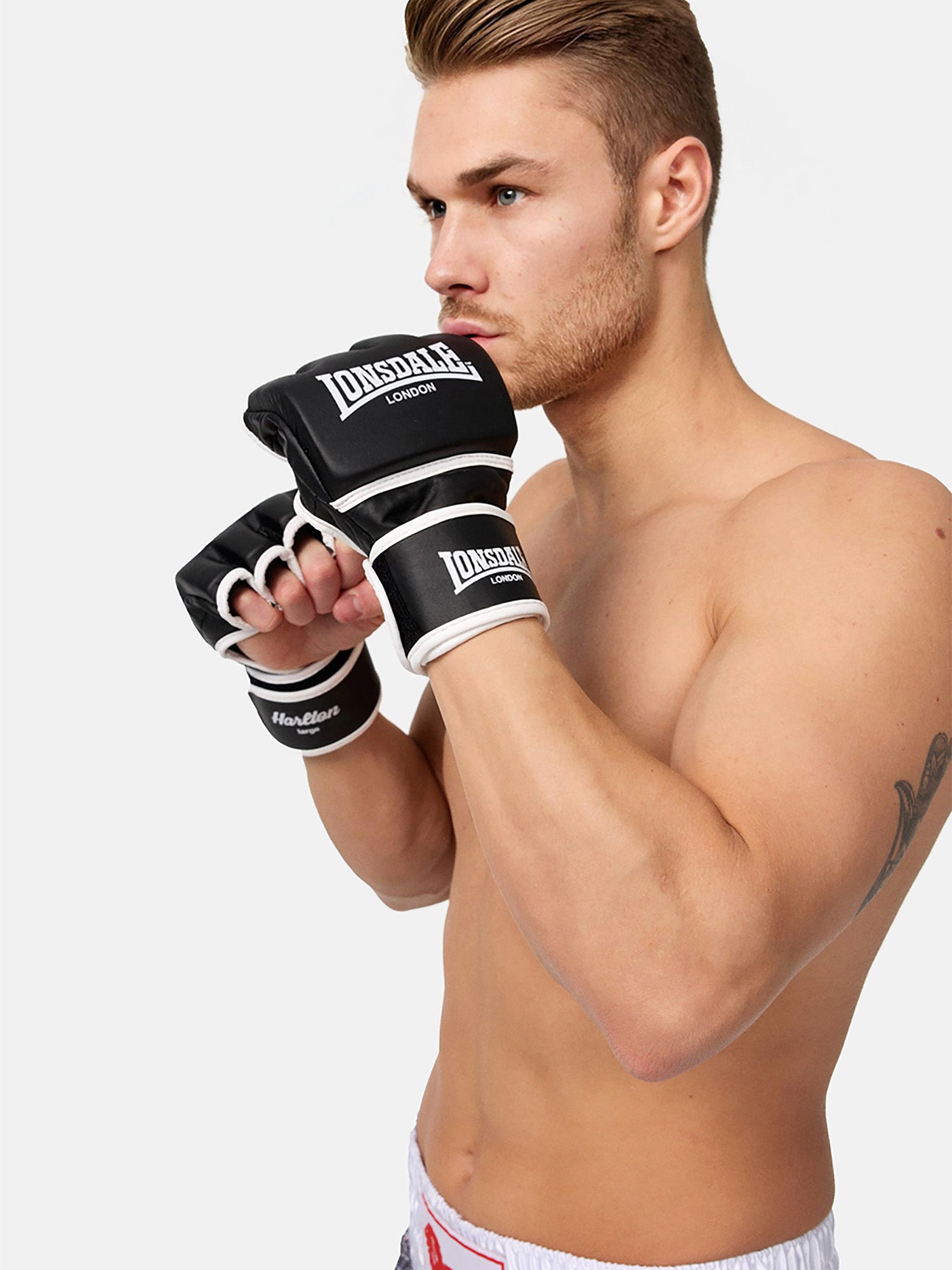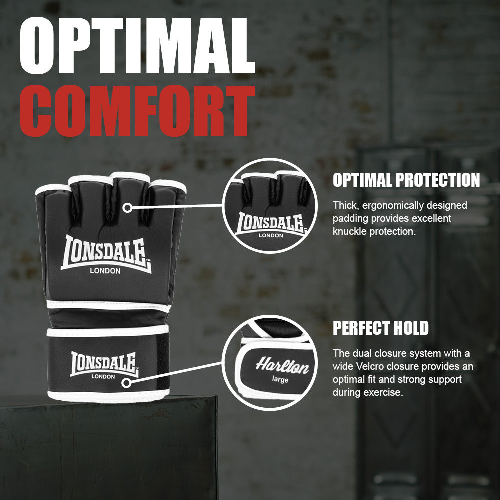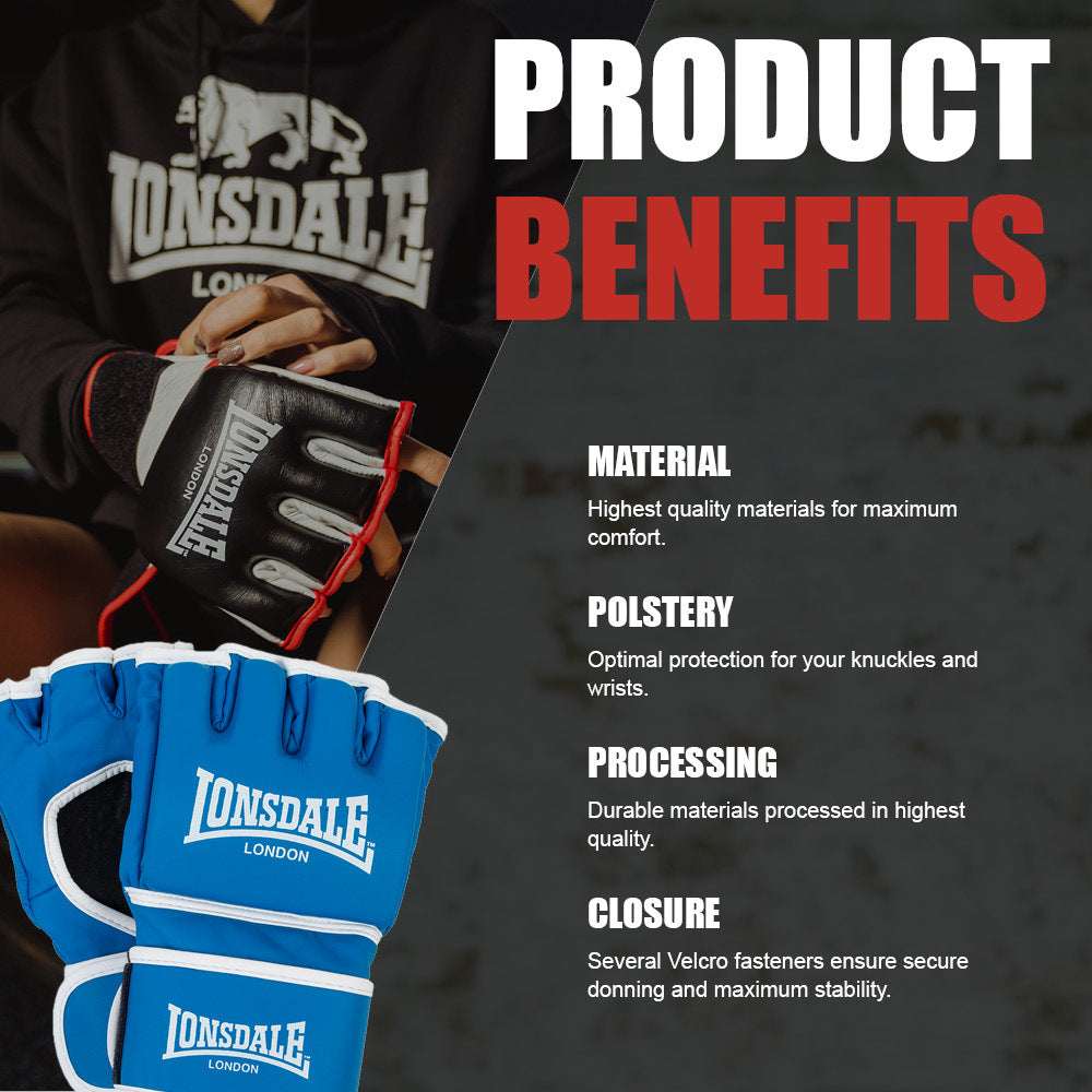 Gefertigt aus hochwertigem Kunstleder verfügt dieser MMA Trainigshandschuh über ein Verschlusssystem mit einem starken Klettverschluss, der für eine optimale Passform und starken Halt während des Trainings sorgt. Die dicke, ergonomisch geformte Polsterung bietet hervorragenden Schutz der Handknöchel. Zwei LONSDALE Markenprints ergänzen den coolen Look.