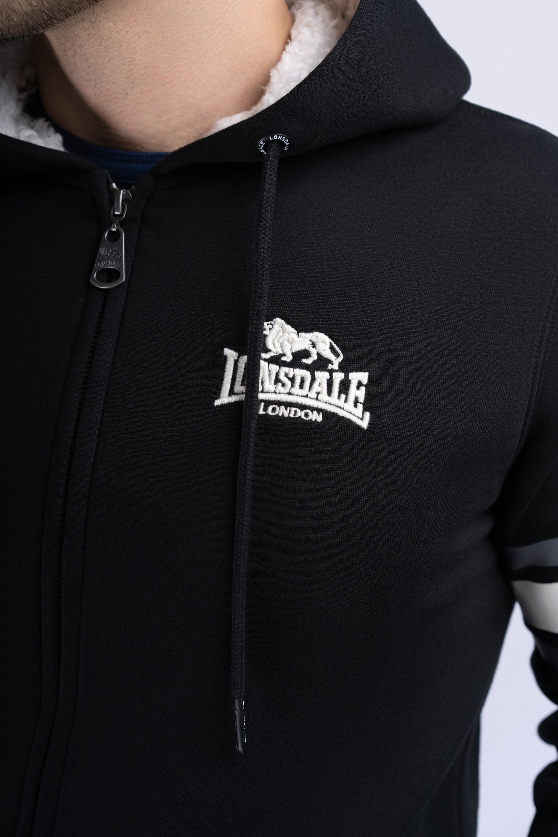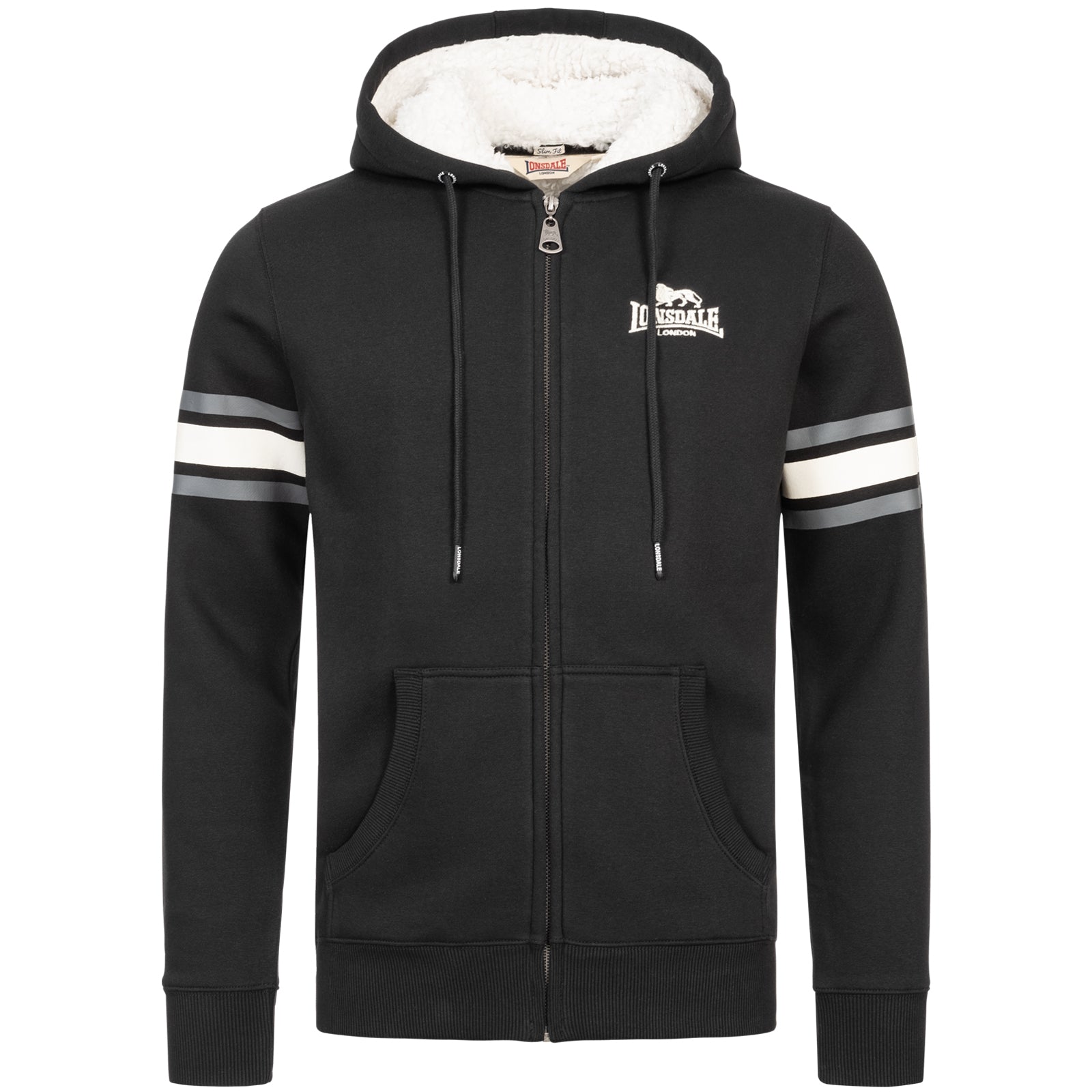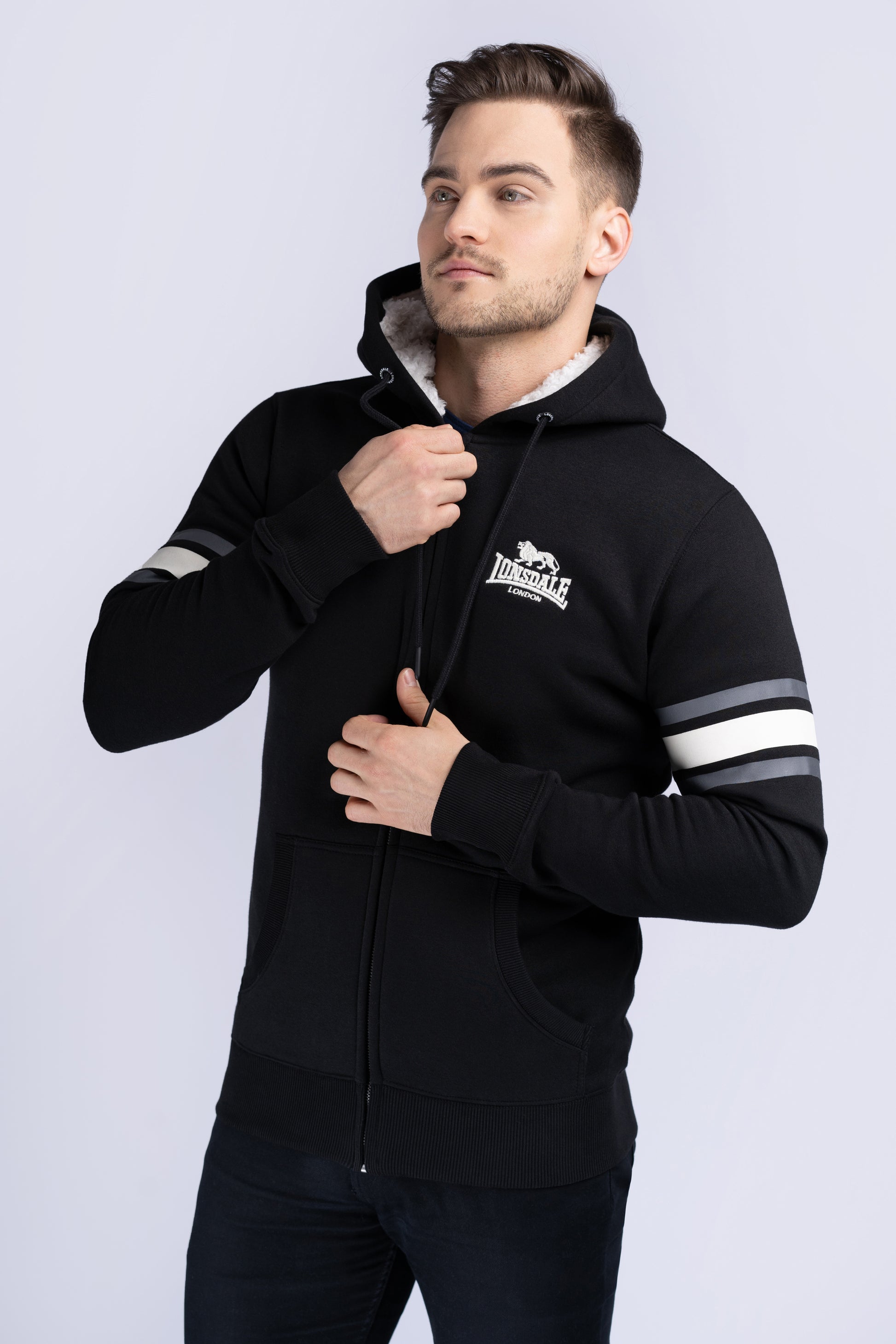 Die sportliche Reißverschlussjacke von Lonsdale besitzt eine kleine Logo-Stickerei auf der Brust und gedruckte Streifen an den Ärmeln. Neben diesen optischen Highlights vervollständigen die Kapuze mit weichem Innenfutter sowie eine Kängurutasche den klassischen Hoodie-Look. Der innen angeraute Fleecestoff ist angenehm weich auf der Haut und sorgt dafür, dass du stets warm angezogen bist.
