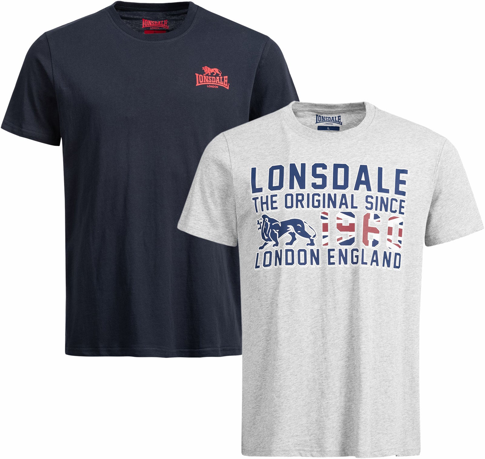 Für modische Abwechslung sorgen die T-Shirts von Lonsdale im Doppelpack. Du bekommst zwei verschiedene Designs in Navy bzw. Marl Grey, aber Schnitt und Linienführung sind gleich. Je nach Lust und Laune kann man sich entweder für das Modell mit kleinem Logo-Druck auf der linken Brust oder für das mit T-Shirt mit plakativem Druck vorne entscheiden.