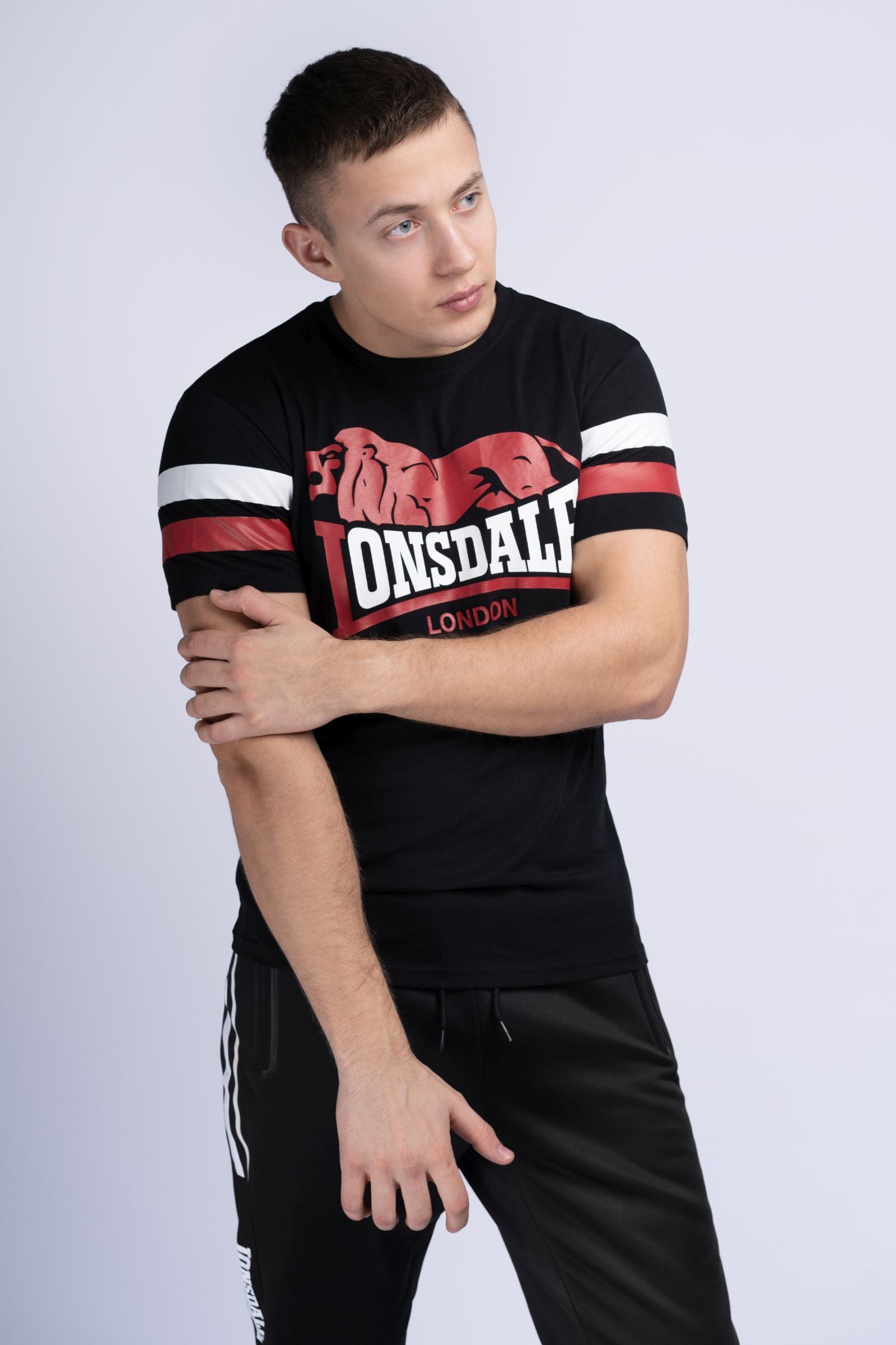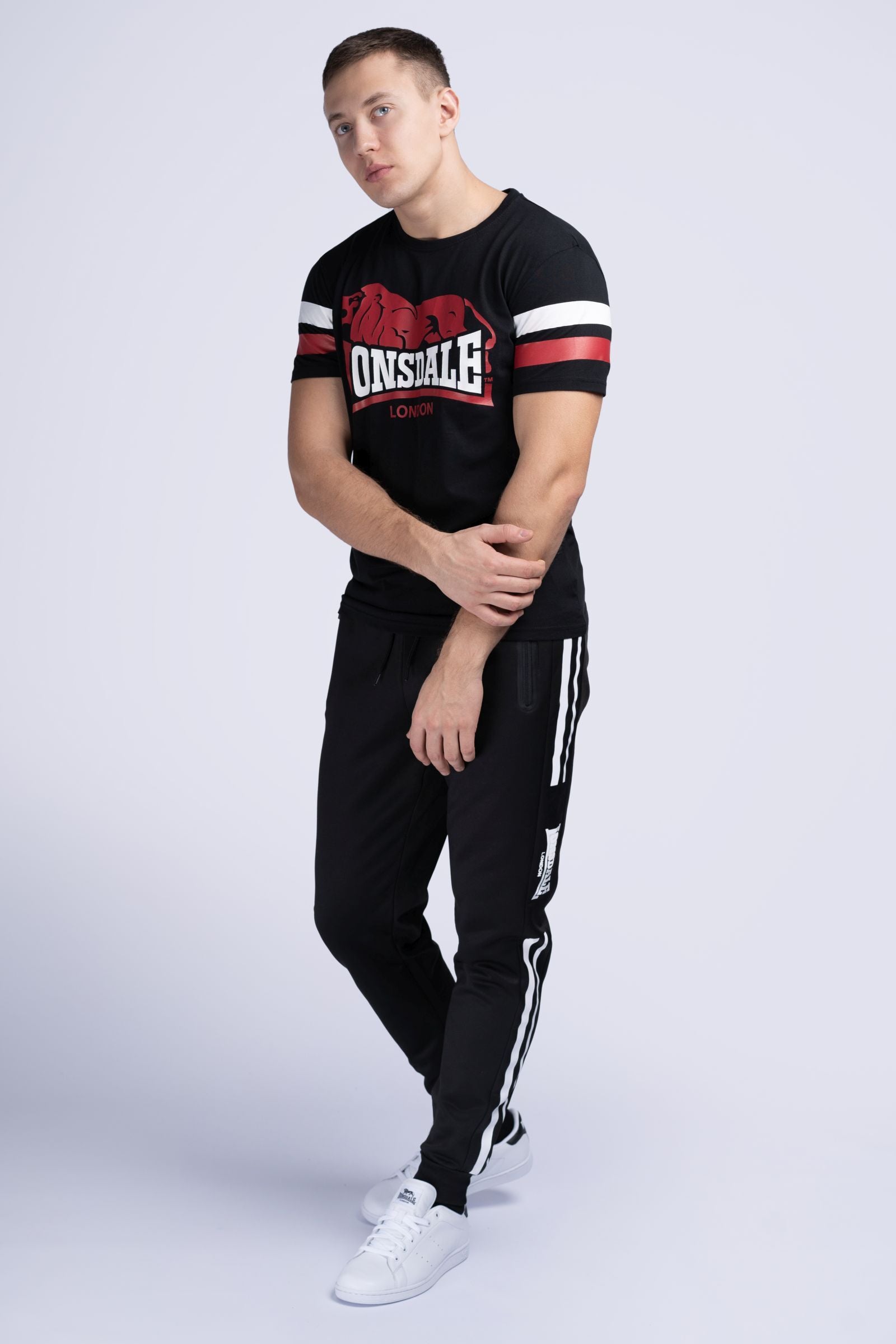Das T-Shirt KILMINGTON zieht mit seinem zweifarbigen Logo-Druck auf der Brust alle Blicke auf sich! Auch die Streifen an den Ärmeln sind in Kontrastfarbe gehalten und sorgen für Aufsehen. Für einen angenehmen Tragekomfort sorgt der weiche Jersey, aus dem das Shirt gefertigt wurde. Wenn es beim Training richtig rund läuft, ist es Zeit für das sportliche T-Shirt von Lonsdale. Auch im Alltag macht es richtig was her! Jeans im Used-Look und lässige Sneakers runden das Styling ab.