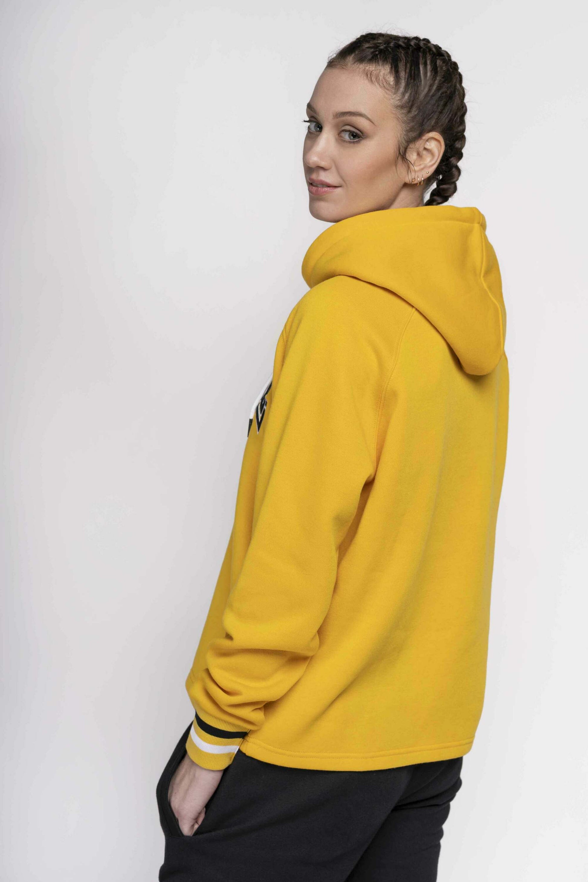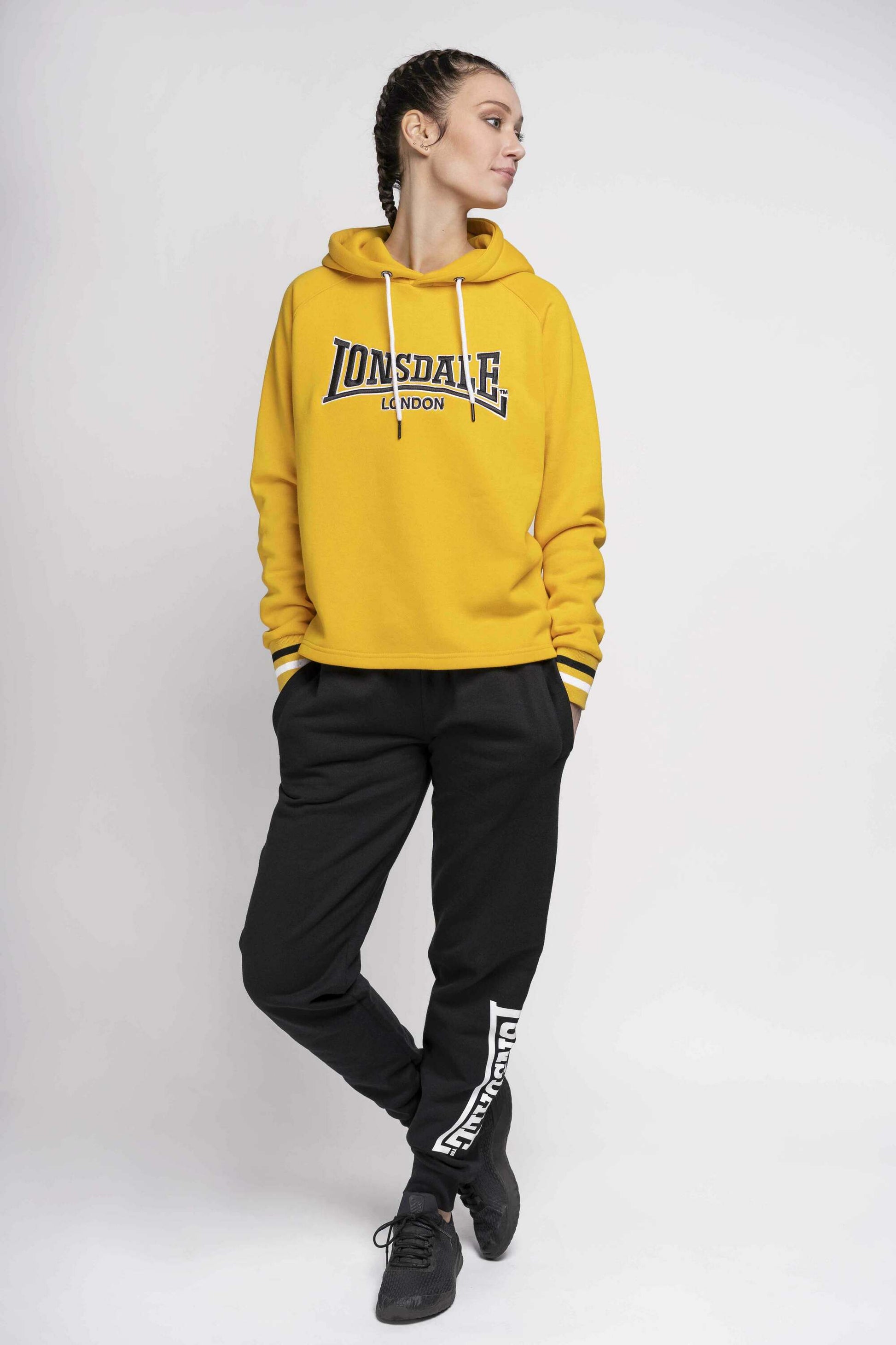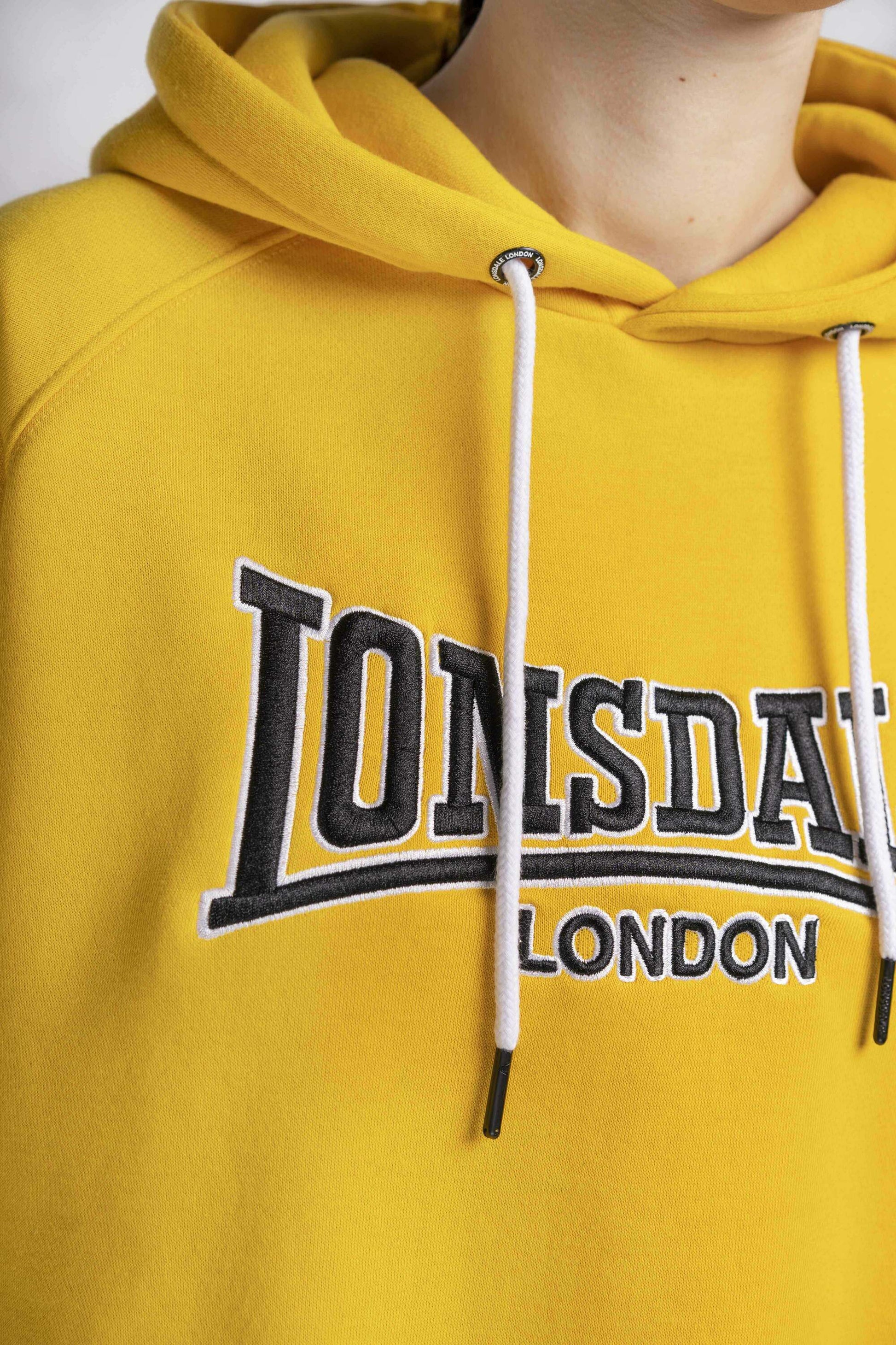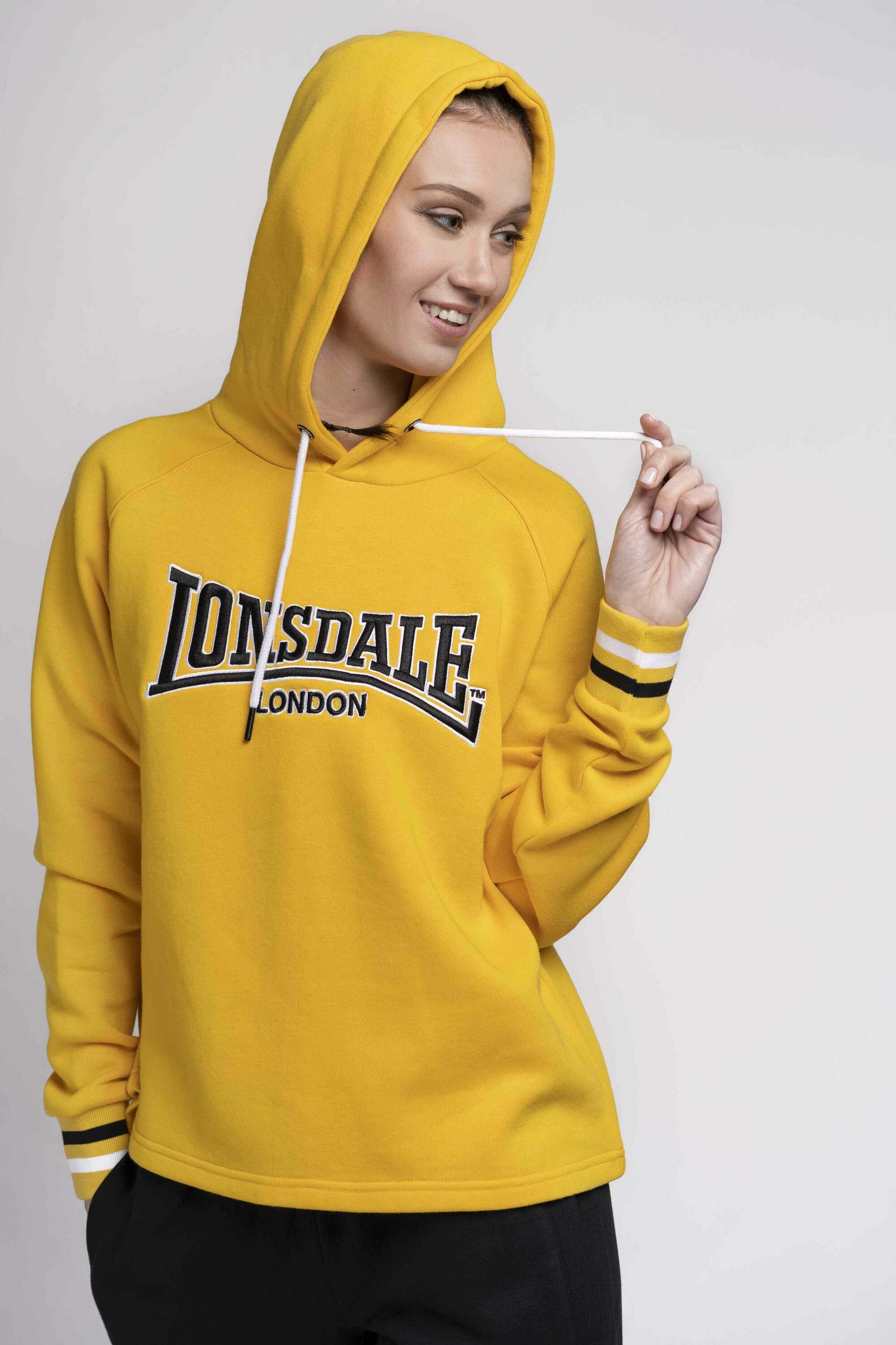 Der Kapuzenpullover von Lonsdale besitzt einen großen Markenschriftzug in Form einer Stickerei auf der Brust. Die leicht erhabene Stickerei ist farblich abgesetzt und springt sofort ins Auge. Die Kapuze ist mit geprägten Ösen und praktischen Kordelzügen ausgestattet. An den Raglanärmeln befinden sich elastische Rippbündchen im Streifendesign. Der innen angeraute Fleecestoff liegt angenehm weich auf der Haut und sorgt dafür, dass du stets warm angezogen bist. Mit anderen Worten: Der Hoodie von Lonsdale hält, was modebewusste Frauen von lässigem Freizeitmode erwarten!