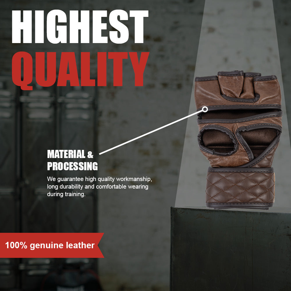 Gefertigt aus besonders hochwertigem und robustem Rindsleder, ausgestattet mit LONSDALE Branding und Steppdetails, sind diese MMA Handschuhe im Vintage Look ein echter Eyecatcher. Die dicke Polsterung wirkt schlagabsorbierend und bietet höchsten Schutz vor Verletzungen an den Händen während des Trainings. Die offenen Bereiche an den Handinnenflächen und den Daumen sorgen für eine optimale Belüftung und lassen alle Arten von Grifftechniken zu. Der breite Klettverschluss sorgt für einen festen Halt und Stabilität am Handgelenk.